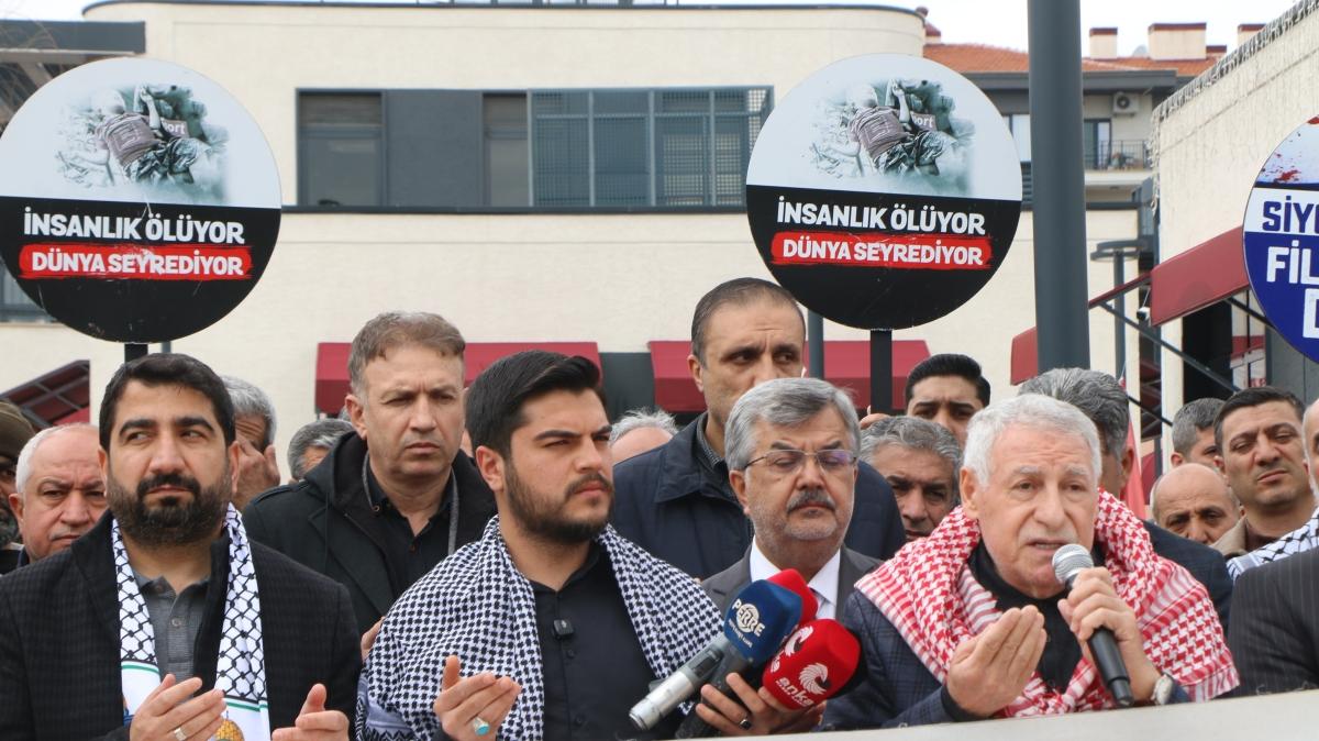 Sık sık sloganların atıldığı açıklamada, İsrail'in Gazze'de sürdürdüğü saldırılar sert ifadelerle protesto edildi.