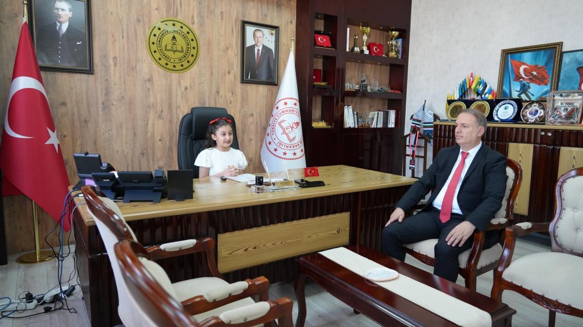 Okul yöneticileri, öğretmenleri ve ailesinin eşlik ettiği ziyarette, İl Millî Eğitim Müdürü Ali Tosun, görevini temsili olarak öğrenci Zeynep Hifa Özdemir'e devretti.